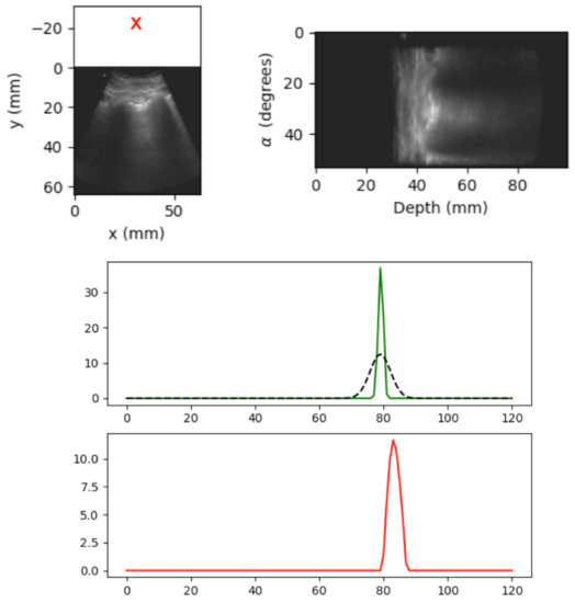 Instead, we focused on the aspects of localization that were useful in the clinical context. B-lines normally extend from the top to the bottom of the image following a radial direction, hence the relevant parameter is the angular position of the B-line. As a result, we assessed spatial localization by comparing the angle at which maximum attention was learned to the ground truth angle from expert annotators. To that end, images were converted to polar coordinates as shown in Figure 7, top. In polar representation, the mean attention over depth was computed for each angle, yielding a 1D attention vector that indicated which angle received more attention from the network, as shown in Figure 7, bottom.