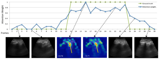 Additionally, a frame with the highest attention weight that is a representative frame with B-lines was identified on the test set with an accuracy of 88.6%. This could be useful to automatically provide clinicians with an exemplar frame to support the classification result.