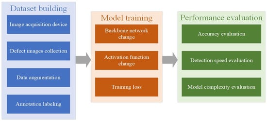 The contents of this paper are organized as follows. Section 2 presents the workflow of the proposed detection approach and the architecture of the proposed detector YOLOv4-MN3. Section 3 introduces the building of a customized dataset, which includes a surface defect image acquisition device, defect image collection, data augmentation and labeling. Section 4 gives the training and detection results with comprehensive comparisons. Section 5 contains our conclusions.