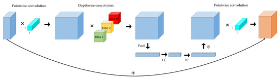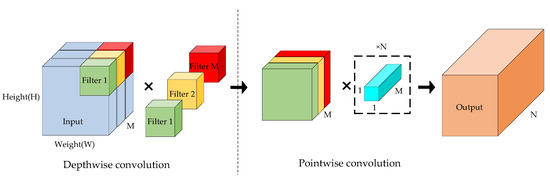 For this study, a cost-effective detector YOLOv4-MN3 was developed, in which the CSPDarknet53 in YOLOv4 was replaced by the lightweight network MobileNetV3. MobileNetV3 utilizes depthwise separable convolution to construct feature maps for each layer. The main convolution process is composed of two parts, as given in Figure 2. The first part is depthwise convolution, and it introduces a filter for each input channel and conducts convolutions for each pair of filter and feature map separately. Its second part is pointwise convolution, and it convolutes a 1 × 1 filter to channels output from the depthwise convolution for the purposes of increasing or decreasing the depth of a feature map. If the convolution input and output are 16 and 32, respectively and the filter size is 3 × 3, then the parameters of standard convolution and depth separable convolution are , respectively, which indicates that depthwise separable convolution can successfully minimize the number of parameters.