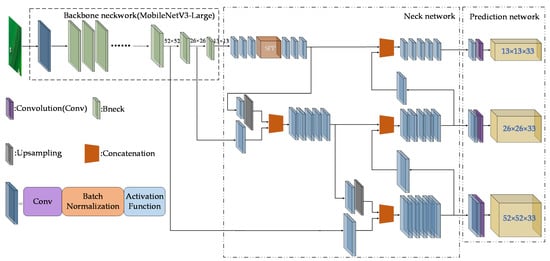 In order to improve the detection accuracy, MobileNetV3 introduces the squeeze and excitation attention module into the bottleneck of MobileNetV2, the basic unit (Bneck) of MobileNetV3, given in Figure 3. Meanwhile, MobileNetV3 modifies the Swish activation function to improve detection accuracy. Experimental results verify the effectiveness and superiority of MobileNetV3 because it can achieve high detection speed and accuracy simultaneously [25]. The MobileNetV3 has MobileNetv3-Small and MobileNetV3-Large—two versions, used according to the depth of its layers. MobileNetV3-Large is employed in YOLOv4-MN3 for a balance of accuracy and speed, based on some initial experimentation. The architecture of YOLOv4-MN3 is given in Figure 4, and only the first 15 Bnecks of MobileNetV3-Large are used to extract three different (52 × 52, 26 × 26, 13 × 13) spatial resolution feature maps, which are directly matched to the input size of the YOLOv4 neck network.