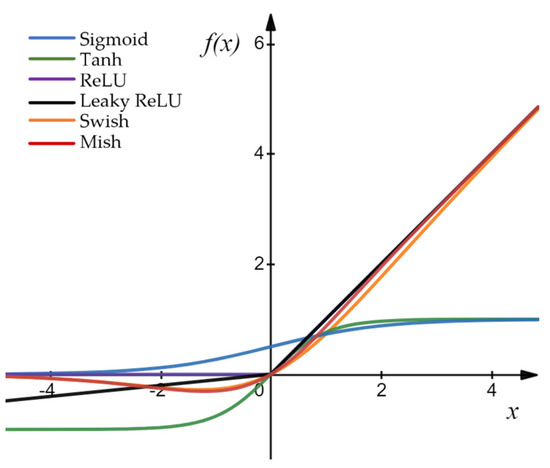 Neural network’ activation functions greatly influence their customized training convergence procedures because of their derivative, monotonicity properties, among others [27]. The selection of activation functions that perform will in training converging and detection accuracy is an essential step for model establishment [28]. Therefore, the sigmoid, tan hyperbolic (Tanh), rectified linear unit (ReLU), leaky ReLU, Swish, and Mish activation functions were implemented and configured for the training files, based on our customized dataset, to optimize the selection of an activation function.