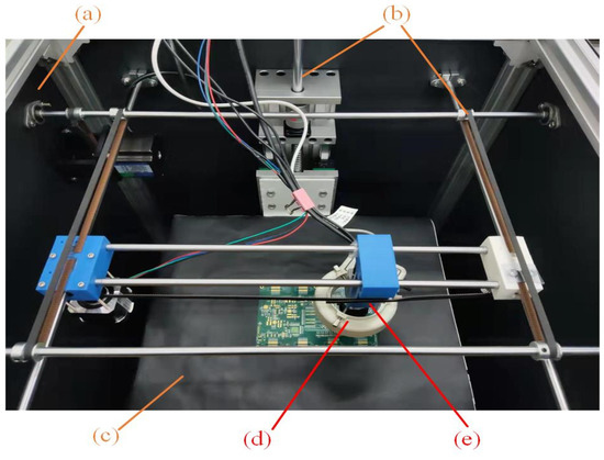 A specially designed image acquisition device is depicted in Figure 6, and it consists of an auxiliary module, an illumination module and an image acquisition module. The auxiliary module provides a physical framework for the installation of the illumination and image acquisition modules, and is composed of a dark box (a), motion control parts (b) and a movable loading platform (c). The illumination module (d) provides suitable lights for the camera’s image acquisition module to take photographs. The image acquisition module (e) is responsible for collecting PCB images and connects to a computer for image storage and preparation, and consists of a camera support framework, Hikvision MV-CE120-10GC industrial camera with 12 million pixels and an external computer. The camera captures PCB images sequentially under the stable light source provided by the illumination module. The maximum field of view is 120 mm × 90 mm, and multi-point shooting was used for PCB s larger than this size, in which the camera is moved by motion control components to locate its position for each shooting.