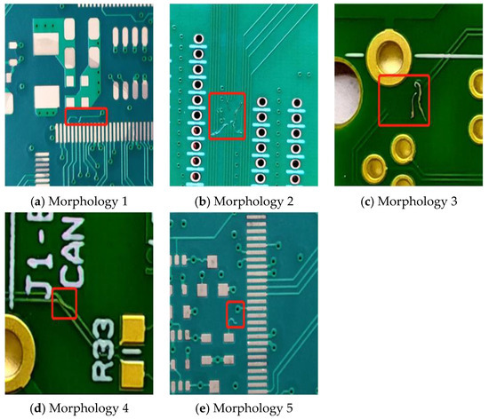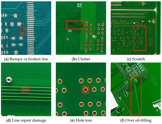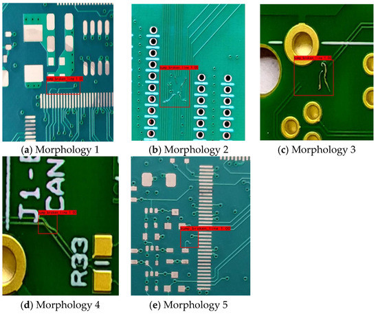 The original 2008 surface defect images, with one surface defect in each, were collected from a PCB production factory in Guangzhou, China, with the device given in Figure 6, and the size of each defect image was 4024 × 3036 pixels. Six categories of defects, including bumpy or broken line, clutter, scratch, line repair damage, hole loss and over oil-filling, were selected, as these six categories of defect account for more than 80% of surface defects in PCB factories, according to historical statistical data. The instances of each category are given in Figure 7. Each type of surface defect possesses several different morphologies and patterns. As shown in Figure 8, there are five typical morphologies of bumpy or broken lines.