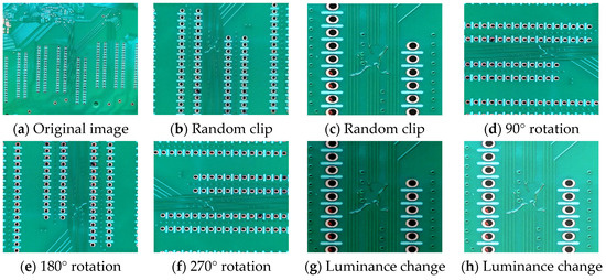 Data augmentation can improve the sample diversity and enhance model generalization. It has been widely used in DL-based model development, especially for industrial applications for which it is difficult to obtain large, labeled samples [27]. Random rotation, cropping, translation, horizontal and vertical flipping, luminance balance, etc. are the commonly used data augmentation techniques. Random clipping, image rotation and luminance changes were conducted to augment the original images in this study. Random clipping crops the image randomly, with a mouse click positioned as the operation’s center, to get different sizes of image. Rotation augmentation rotates the image at 90°, 180° and 270° angles, such that four different angles of the same defect can be obtained. Luminance changes specify brightness values, adjusting the brightness of the original image. Rotation and randomly clipping images aid detection performance and the robustness of improvement. Luminance changes simulate the deviating brightness of different environmental lighting and improves models’ adaptability to different lighting [32]. Some instances of these augmentations are given in Figure 9.