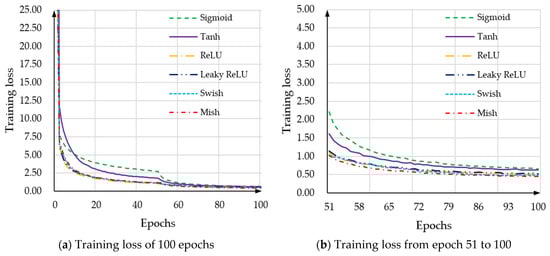 Popular activation functions in neck and prediction networks, including Sigmoid, Tanh, ReLU, Leaky ReLU, Swish, and Mish were implemented and experimentally compared based on the customized dataset. The detection performance of the six activation functions is shown in Figure 10 and Table 4. In Figure 10a, the training losses of Sigmoid and Tanh are higher than other four activation functions at the first 50 epochs, and they tend to stop converging at the end of the first training stage. However, the training losses of all activation functions decreased again, at the 51st epoch, when all the parameters were unfrozen at the second training stage. Since the training losses were close to each other in the second stage, we selected the training loss from epoch 51–100, given in Figure 10b, to amplify the loss difference between different activation functions clearly. The detailed comparison result given in Figure 10b shows that Mish obtained the lowest training loss, which indicates it had the best training result, generally. It can be roughly concluded that Mish outperformed the other activation functions.