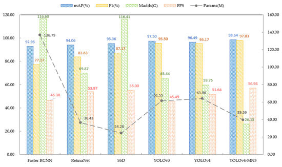 The detection accuracy, speed and model complexity of YOLOv4-MN3 were tested and compared with the other five SOTA detectors, Faster RCNN, RetinaNet, SSD, YOLOv3, and original YOLOv4. The experimental results of the different indicators are illustrated in Figure 11. It can be seen that the proposed YOLOv4-MN3 achieve the highest detection accuracy, with a 98.64% mAP value, which is 5.69%, 4.58%, 3.28%, 1.14% and 2.15% superior to Faster-RCNN, RetinaNet, SSD, YOLOv3 and YOLOv4, respectively. Meanwhile, YOLOv4-MN3 outperformed the other five compared models in F1, at 20.66%, 14.00%, 10.66%, 2.33% and 2.66% higher than Faster-RCNN, RetinaNet, SSD, YOLOv3 and YOLOv4 respectively. In terms of model complexity, YOLOv4-MN3 greatly reduced its parameters and Madds. The number of Params needed by YOLOv4-MN3 reduced by 28.94%, 64.32% and 61.90% those of Faster RCNN, YOLOv3 and YOLOv4, respectively, and the Madds of YOLOv4-MN3 was 90.45 G, 39.29 G and 33.60 G lower than of Faster RCNN, YOLOv3 and YOLOv4, respectively. The reason for this is that MobileNetV3 uses depthwise separable convolution, replacing the standard convolution, allowing the convolution weights and operations to be reduced greatly. In addition, RetinaNet and SSD had small numbers of parameters but large Madds. The reason for this is that the number of parameters indicates the space complexity or storage consumption, and Madds is the metric of time complexity. Detectors with small Params cannot ensure lower Madds or higher detection speed, and vice versa. For example, the activation function and pooling operations increased Madds while Params remained unchanged. Meanwhile, we can see that the Madds of YOLOv4-MN3 is 43.72 G and 90.26 G lower than RetinaNet and SSD, although with a slight increase in parameters. YOLOv4-MN3 also had significant advantage in detection speed, and its FPS value was greater by 10.60, 3.01, 1.98, 11.49 and 5.34 than those of Faster RCNN, RetinaNet, SSD, YOLOv3 and YOLOv4. Based on the comparison of SOTA detectors, the YOLOv4-MN3 model delivered significant advantage in terms of detection accuracy, model parameters, operations and detection speed.