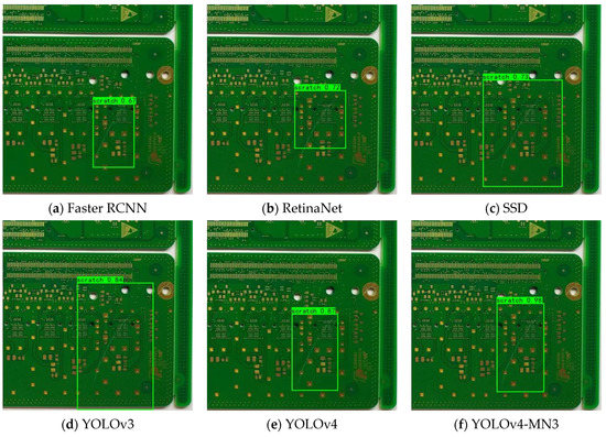 Figure 12 gives some detection instances obtained by YOLOv4-MN3 and the compared detectors. The detection instances given in Figure 12a,b show that Faster RCNN and RetinaNet only detected a part of the defect with low confidence. SSD and YOLOv3 defect the whole defect but also with low confidence, as shown in Figure 12c,d. Figure 12e,f indicates that both YOLOv4 and YOLOv4-MN3 could detect the whole defect. However, YOLOv4-MN3 achieved the highest confidence 0.98, while the confidence of YOLOv4 was only 0.87, in this instance.