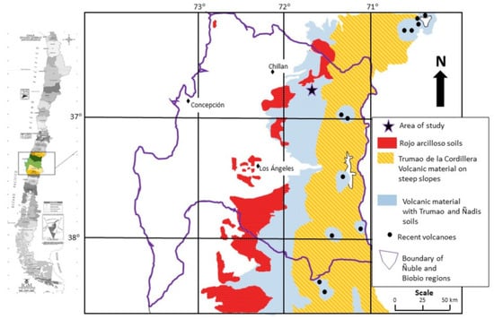 Distribution of the different volcanic soils in the Ñuble and Biobio regions and the location of the area of study. (Modified after [26]).