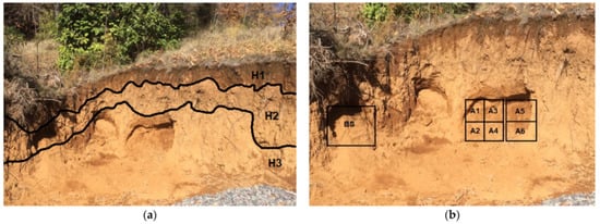Roadside cut where the Trumao samples were extracted for the laboratory studies; (a) soil horizons are defined based on weathering, (b) location where the sample blocks were collected.