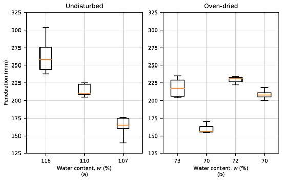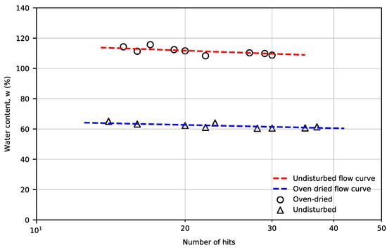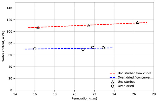Two methods were used to study the liquid limit of the material: the Casagrande method (ASTM D4318) and the fall cone method (BS 1377-2). Figure 3 shows the results obtained with the Casagrande method. A total of nine determinations with different moisture contents were carried out in this investigation. The liquid limit determined with the Casagrande method on the undisturbed and oven-dried samples was 110% and 62%, respectively. For the cone fall method, several penetrations were applied to each sample for every moisture content, as indicated in BS 1377-2. The number of determinations used to determine the liquid limit of undisturbed and oven-dried samples with the cone fall test were 16 and 14, respectively. The moisture content was determined in three different stages for the undisturbed and four for the oven-dried samples. Figure 4a,b shows the results obtained in the cone fall tests for the undisturbed and oven-dried samples, respectively. The mean moisture content was plotted against the resulting penetration to obtain the liquid limit (Figure 5). The liquid limits determined with the cone fall test were 110% and 83% for the undisturbed and oven-dried samples, respectively.