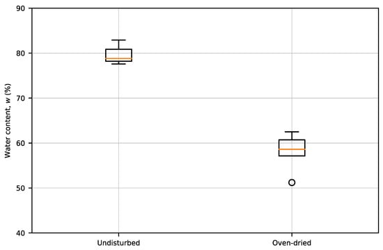 The plastic limit was obtained for the undisturbed and oven-dried samples using three and five samples, respectively. Figure 6 shows the results of the plastic limit as a box plot representation. The mean plastic limit determined for the undisturbed samples was 80%, while the oven-dried was 58%.