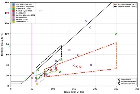 Wesley [15] studied volcanic clays located in Java (Indonesia) and determined areas on Casagrande’s chart where andosols and latosols can be found. These soils are mainly composed of allophane and halloysite, respectively. The areas mentioned can be seen in Figure 7 with the black dashed line representing latosols and the red area andosols.