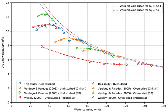 The maximum dry density and the optimum moisture content obtained on undisturbed and oven-dried allophanic soils samples are significantly different. Similar results were observed by other researchers [9,13]. The optimum moisture obtained in oven-dried samples ranges from 35 to 60%, while in the undisturbed samples it is between 70 and 140% (Figure 8). In contrast, the maximum dry density is higher in oven-dried (: 9 to 12 kN/m3) than in undisturbed samples (: 5 to 9 kN/m3). Some Proctor curves found in the literature cannot be used to determine the compaction characteristics as they do not have a clear maximum or they do not even show a relationship between dry unit weight after compaction and soil water content. For this reason, in this study, these curves were not analyzed, and thus their results are not included in this investigation. One of these curves can be seen in Figure 8, corresponding with oven-dried material from Indonesia [9]. The author suggests using a different compaction control method for those materials, based mainly in strength rather than in compaction itself.