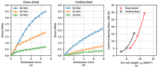 California Bearing Ratio (CBR) tests were carried out to complement the Proctor test results. Figure 9a,b shows the stress applied of each specimen against the penetration of the undisturbed and oven-dried samples, respectively. For example, in the specimen prepared applying 56 hits per layer, the dry unit weight obtained for the undisturbed samples is equal to 9.1 kN/m3, whereas for oven-dried samples it is equal to 10.7 kN/m3. The CBR is determined at the penetration of 5.08 mm for both samples, with a value of 15.4 and 29.4%, for the undisturbed and oven-dried samples, respectively. Therefore, the CBR at 5.08 mm of penetration determined in the oven-dried specimen doubles the one obtained for the undisturbed samples. Thus, commercial laboratories should not dry allophanic soil samples in the oven to measure the CBR due to significant changes in their results. This is especially relevant as the obtained values for oven-dried samples are significantly higher, leading to unsafe designs. For example, for AASHTO technical standards, a CBR equal to 100 for the granular base layer and about 30 for the granular subbase is required. According to this standard, the oven-dried allophanic soil could be used as subbase material in pavement construction with a CBR of 29.4%, while the same soil in undisturbed conditions (with a CBR of 15.4%) could only be used as a subgrade. The variation of the CBR with the dry specific weight for both samples is presented in Figure 9c. The behavior of an intermediate state has not been evaluated in this work, such as drying in the air or under the shade.