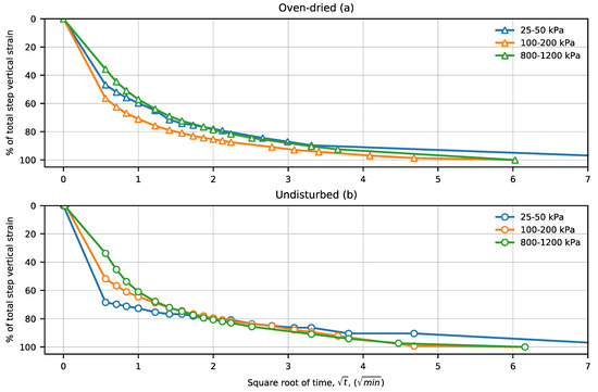 Figure 11a,b shows the variations of the settlement percentage with the square root of time (Taylor’s procedure) at 25 to 50, 100 to 200, and 800 to 1.200 kPa increments for undisturbed and oven-dried allophanic soil samples tested. None of the curves shown in Figure 11 can be used to determine an accurate value of the coefficient of consolidation.