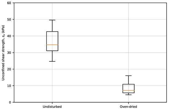 Cylindrical specimens with a diameter of 50 mm and a height of 100 mm were tested in the laboratory to obtain the undrained shear strength of the material. A total of 18 samples were tested, 9 for the undisturbed state and 9 subjected to oven-drying. Figure 12 shows a box plot of the obtained results for both states.