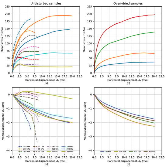 Direct shear test results (a) Shear stress against shear displacement for undisturbed specimens. (b) Vertical displacement against shear displacement for undisturbed specimens. (c) Shear stress against shear displacement for oven-dried specimens. (d) Vertical displacement against shear displacement for oven-dried specimens.