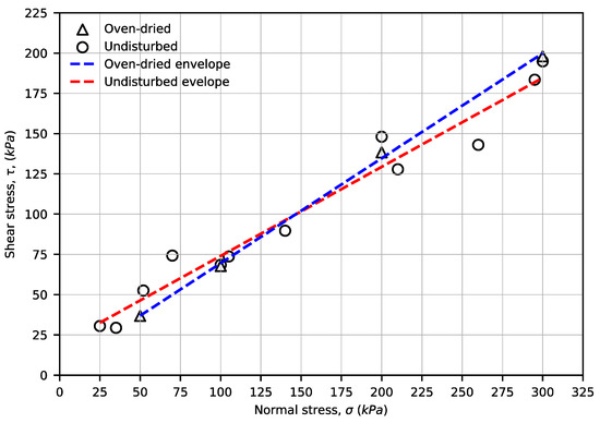To study the drained shear strength of the material, the Mohr–Coulomb criterion was used. Figure 14 shows the linear envelopes obtained for undisturbed (red line) and oven-dried (blue line) samples.