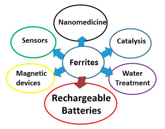 The term ferrite indicates a broad class of ceramic oxide materials, joined by the presence of iron ions and largely applied during the last five decades [1]. They are well-known and -studied materials with an impressively wide range of applications (Figure 1) extending from millimeter wave integrated circuitry to power handling, simple permanent magnets and magnetic recording [2], catalysis [3], sensors [4], energy [5], and in nanomedicine from magnetic hyperthermia to drug delivery [6] and imaging in magnetic resonance [7] up to electrochemistry (for rechargeable ion batteries) [8].
