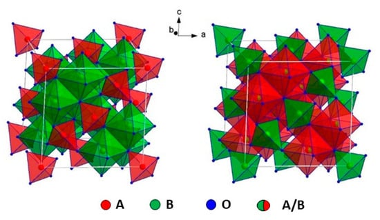 It is defined as normal spinel the one in which the B3+ and A2+ cations occupy octahedral and tetrahedral sites, respectively (Figure 2, left), while the inverse spinel has a radically different cation distribution, where half of the trivalent cations occupy the A sites, while the B sites are shared by the divalent and the remaining trivalent cations (Figure 2, right). Complex spinels, in which bivalent and trivalent cations occupy in a random way the tetrahedral and octahedral sites, can be also stabilized.