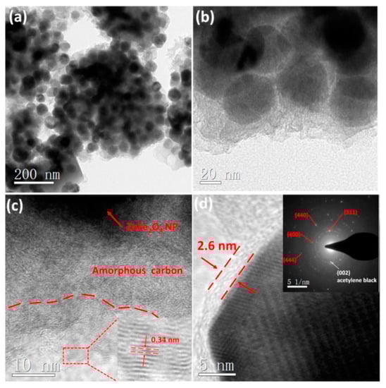 TEM (a,b) and HR-TEM (c,d) images of the Acetylene black/ZnFe2O4-NPs@C; the inset in (d) is the SAED pattern [31]. Reproduced with permission, Copyright Elsevier 2016.