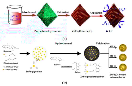 (a) Scheme of the formation of porous ZnFe2O4/α-Fe2O3 micro-octahedrons based on a two-step solvothermal method followed by thermal treatment [51]. Reproduced with permission, Copyright Elsevier 2014]. (b) Schematic illustration of the one-pot hydrothermal reaction of various shelled ZnFe2O4 hollow microspheres using a composite solution of sucrose in water and metal ions in ethylene glycol, followed by different calcination processes [52].