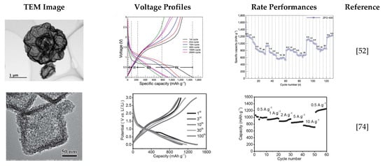 The use of metal-organic framework MOFs as electrode materials for LIBs is growing, due to their inimitable structure, tunable morphology, well-developed porosity, high specific surface area, and excellent lithium storage capacity. The open crystal frameworks of MOFs can deliver efficient and reversible ionic insertion/extraction [100]. Prussian Blue (a kind of metal-organic framework) can react with Zn acetate under microwave irradiation, forming hydroxides’ and carbonates’ nanosheets on the surface of Prussian Blue itself. After pyrolysis, a composite of ZnO/ZnFe2O4 porous nanoparticles was obtained [101], showing a good capacity of 804 mAh g−1 for 500 cycles at a current density of 1 C.