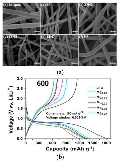 (a) FESEM images of as-spun Zn1-xMnxFe2O4 with various manganese content nanofibers [37]; (b) first galvanostatic charge−discharge cycle of ZFO and MgxCu0.2Zn0.82−xFe1.98O4 (x = 0.20, 0.25, 0.30, 0.35, and 0.40) calcined at 600 °C [40].