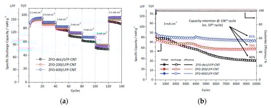Some of the most encouraging electrochemical results obtained in these last years on the ZFO active material are reported in Table 1. The ink composition, carbon type, and the electrolyte mixture are reported together with the discharge capacity values and the long-cycling performances.