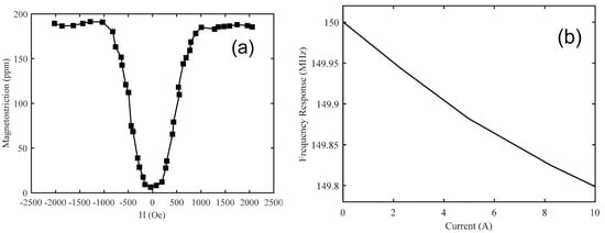 The measured magnetostriction curve characteristic of FeGa is shown in Figure 3a. The simulation was done to predict the sensitivity of the proposed sensor. The parameters of LiNbO3 and SiO2 used in the simulation were consistent with the literature [11]. The mechanics and electrical boundary conditions were also the same as the literature [11]. The film thickness was set to 500 nm, and the aspect ratio was set to 1:1. The sensitivity of the proposed current sensor is calculated as ~20.3 kHz/A, as shown in Figure 3b. Compared with the sensitivity of ~11 kHz/A mentioned in the literature [11], the sensitivity of the proposed sensor is increased by ~9 kHz/A. The results reveal that the FeGa film can effectively improve sensor performance.