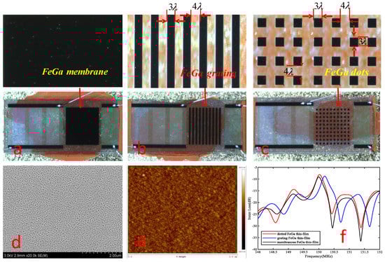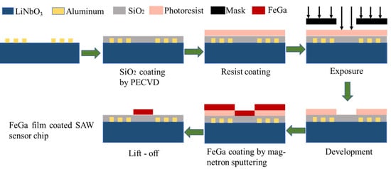 Then, the FeGa thin film was deposited onto the acoustic propagation path of the developed SAW chip to build the sensing device by employing the lift-off process. The corresponding details are described in Figure 4. Firstly, the photoresist was deposited on the prepared SAW device. Then, through a photolithography mask, the photoresist was removed in the areas, where the FeGa thin film was to be located; then, the FeGa thin film was sputtered onto the surface of the SAW chip using radio-frequency magnetron sputtering. The sputtering conditions for the base pressure, sputtering power and target-substrate distance were 1.5 × 10−5 Pa, 100 W, and 60 mm, respectively. The Ar gas was used as the sputtering gas, and corresponding pressure was set to 1 Pa. After removed the remaining photoresist, the FeGa thin film with various patterns (dot, grating, and membrane) was formed on the SAW chip. Here, the strip width in each FeGa grating was set to 3λ, and the corresponding grating spacing was set to 4λ. Similarly, the length width of each FeGa dot was set to be 3λ × 3λ, and dot spacing in each direction was set to 4λ. The developed SAW sensing devices with various FeGa thin-film patterns were pictured in Figure 5a–c.