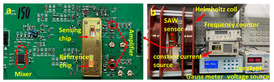 The experimental setup for characterizing the developed SAW sensor is described in Figure 6b, which is composed of a Helmholtz coil system with measure range of 0~10 A, Gaussmeter, SAW sensor, frequency counter, constant current source, and constant voltage source. By varying the coil current generated by the constant current source, the Helmholtz coil can create a varying magnetic field. The differential oscillation loop is supplied with a voltage of +5 V provided by the constant voltage source. The sensor signal is collected by the frequency counter at 60 points per minute and is plotted by the PC in real time. During the test, the SAW device was exposed to the magnetic field, and the differential oscillation loop was wrapped with aluminum foil so as to reduce the influence of the magnetic field on the circuit.