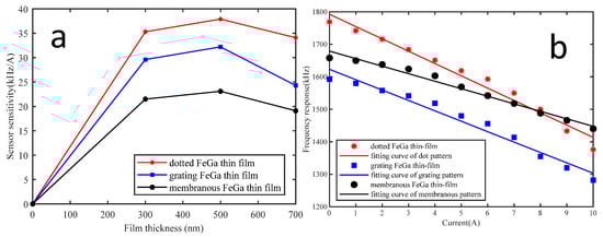 First, the sensitivity of the prepared sensor was evaluated by measuring the sensing response towards increasing current values from 0 to 10 A at room temperature (25 °C) using the experimental setup described in Figure 6b. The effect from FeGa film thickness on sensitivity was demonstrated by measuring the sensitivity of developed sensors with various FeGa film thicknesses (300 nm, 500 nm, and 700 nm), as shown in Figure 7a. Obviously, the sensitivity increases with increasing thickness of FeGa film. This can be explained by the following formula [29]: