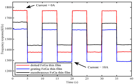 where xi, , and N are the ith measurement, the average of the measurements, and the number of measurements, respectively. Hence, the standard deviations of 0.99, 0.71, and 1.13 were calculated from the sensing devices coated with dotted, grating, and membranous FeGa thin film, respectively. It can be seen that excellent reproducible runs were obtained from the prepared sensing device with various FeGa patterns. Moreover, when the current was switched from 0 A to 10 A, the frequency response of the three sensors dropped rapidly to a steady state, which means a very fast response was achieved. Moreover, sensor responses over 200 kHz towards 10 A were obtained from the sensing devices. The largest response up to 393 kHz was achieved from the sensing device coated with dotted FeGa thin film owing to its enlarging magnetostrictive properties [9].