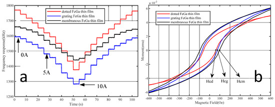 Meanwhile, the hysteresis characteristics of the FeGa thin film coated SAW devices were evaluated as shown in Figure 9a. In the measurement, the applied current increased first and then decreased with a step of 1 A, and each applied current lasted for 5 s. Usually, the hysteresis error is defined by