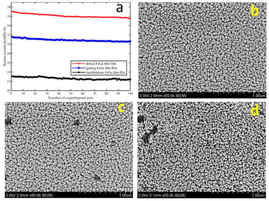 Magnetostrictive strain usually leads to fatigue and aging of magnetic-sensing films. Thus, the fatigue characteristics of the FeGa thin film were investigated by cycle testing of the sensitivity of the developed sensing devices. The number of cycles was set to 100. In each cycle test, the current of 0~10 A was applied to the sensing device coated with various FeGa thin-film patterns to obtain the detection sensitivity. The cycle interval was set to 10 min. Table 3 shows the statistical analysis of the relationship between the sensor sensitivity decrease rate and the number of cycle runs. It can be seen that the sensitivity of sensors with different patterns decreased slightly with the increasing cycle runs. However, the performance decline was less than 4% after 100 cycle runs, which is acceptable. Obviously, thanks to the good ductility and strong impact resistance of FeGa thin film itself, excellent long-time stability and weak fatigue were observed (Figure 10a), which was far better than that of the FeCo thin film [30]. Moreover, The SEM views of the FeGa thin film after 0, 50, 100 cycle testing runs are depicted in Figure 10b–d. It can be seen that the unloaded FeGa thin film was perfectly uniform. Although a few cracks appeared after 100 runs, most areas of the film remained uniform. It means excellent stability was achieved from the FeGa thin film coated sensing device in long-term runs.