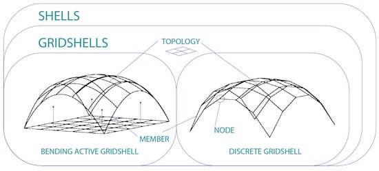 The following section presents the focus of the article and defines the main terms applied. See also Figure 1. A shell structure is a curved surface structure that derives its strength from its geometry, typically constructed from timber, metal, concrete or masonry. Shells are generally thin in the direction perpendicular to the surface, and work through a combination of membrane (mainly) and bending action [10] (p. 31). A Gridshell, lattice shell or reticulated shell is a general term for a shell constructed from some kind of grid of linear members rather than a surface. The terms are used inconsequently. Gridshell is most often used to describe those built with timber and bent during erection (bending active), while the term reticulated shell is more typically used for metal structures, often barrel vaults, spherical caps, or braced domes, for industrial purposes.