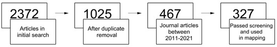 The final search was carried out on 23 September 2021. The search was limited to the topic (title, abstract and keywords), which the databases allowed in various ways, and when possible, limited to journal articles, written in English. The exact search queries are found in Table 2. Table 2 also presents the number of results obtained from each database, a total of 2372 hits.