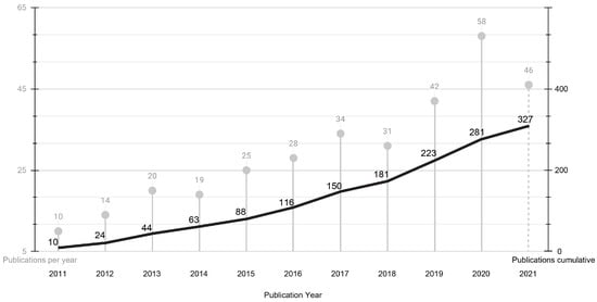 Publications per year of the mapped articles. The search was conducted in September 2021 and is therefore not covering the total of 2021.