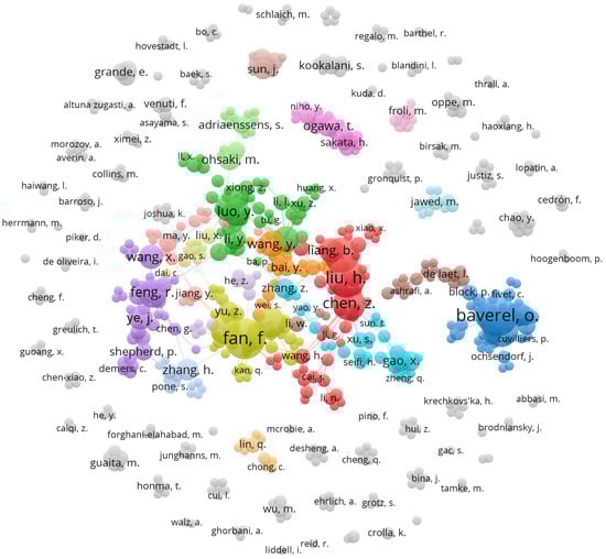 Authors of all the publications mapped according to the co-authorship. The colours represent clusters of authors with higher co-authorship. The map was created with VOSviewer [16].