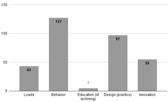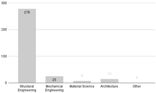 As seen in Figure 7, 278 articles were categorised in the field of structural engineering. The second-largest category was mechanical engineering (25). Few articles were categorised as architectural research (15), and even fewer as material science (8).