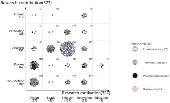 As seen in Figure 8, analyses’ contributions are typically motivated by behaviour (94), followed by loads (36). Furthermore, the analyses are mainly performed as theoretical studies. Examples from analyses are [17,18,19]. Tool/method contributions are typically motivated by design practice (43), followed by innovation (14). Furthermore, the tool/method contributions are also mainly performed as theoretical studies. Examples from tool/method are [20,21,22]. Process contributions are also typically motivated by design practice (41), followed by innovation (15). Furthermore, the process contributions are also mainly performed as project presentations. Examples from process are [23,24,25]. Verification contributions are also typically motivated by behaviour (19). Furthermore, the verification contributions are also mainly performed as experimental studies. Examples from verification are [26,27,28]. Product contributions are almost only motivated by innovation (9). Furthermore, the product contributions are mainly performed as experimental studies. Examples from products are [29,30,31]