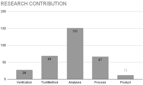 The research contribution facet has been mapped in the five categories verification, tool/method, analyses, process and product, as described in Section 1.1. As seen in Figure 9, the most common contribution was analyses with 151 articles, followed by tool/method (69), processes (67), verification (28), and product (12).