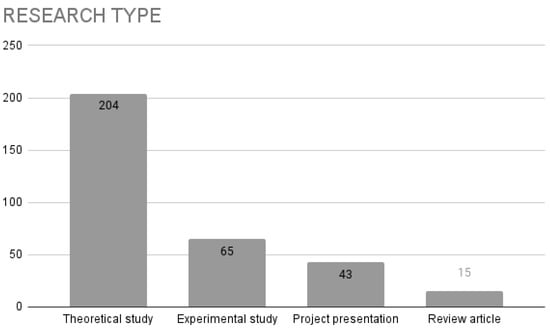 The research type facet was mapped in four categories, theoretical study, experimental study, project presentation, and review article, as described in Section 1.1. As seen in Figure 11, the most common research type found was theoretical studies with 204 articles. This was followed by experimental study (65), project presentation (43), and review article (15).