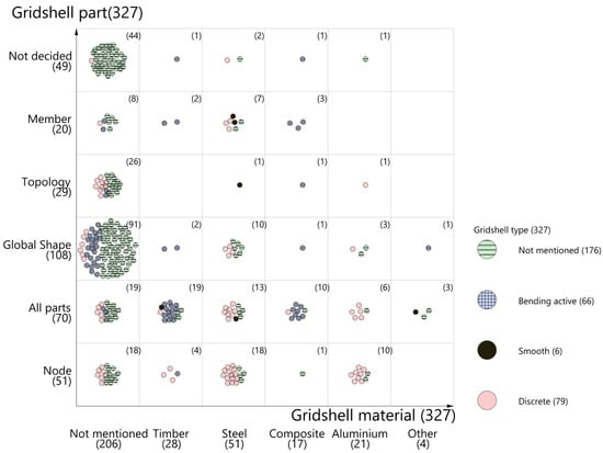 The bending active gridshells, marked in blue in Figure 12, typically focus on all parts or the global shape regarding the gridshell part. Furthermore, the studies on bending active gridshells are mostly timber or composite regarding material. Examples from the bending active facet are [21,24,34]. The discrete gridshells, marked in red in Figure 12, typically focus on all parts or the node regarding the gridshell part. Furthermore, the studies on discrete gridshells are mostly steel regarding material. Examples from the discrete facet are [64,65,66]. The smooth gridshells, marked black in Figure 12, are relatively few and placed with no particular trends regarding part or material. Examples from the smooth facet are [23,67,68]. Examples of studies where the type was not mentioned are [54,69,70].
