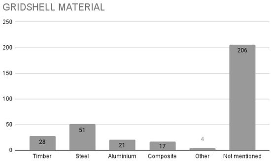 The gridshell material facet was mapped in the six categories, timber, steel, aluminium, composite, other and not mentioned, as described in Section 1.1. The material facet describes the member material. As seen in Figure 13, the material is typically not mentioned (206) in the studies. Steel (51) was, therefore, the most used material, followed by timber (28), aluminium (21), composite (17) and others (4). Regarding material, classification on the node-material was also done, but this resulted in even fewer articles where the material could be determined, and this facet was therefore excluded. When node material was determined, it was also almost always the same as the member material, with the exception of timber gridshells with metal nodes.
