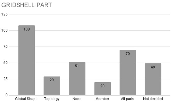 The gridshell part facet was mapped in the five categories, global shape, topology, node, member and all parts, as described in Section 1.1. As seen in Figure 14, the part studied is typically the global shape with 108 studies. This is followed by studies on all parts (70), node (51), topology (29) and member (20). There were also 49 studies where the part could not be decided.