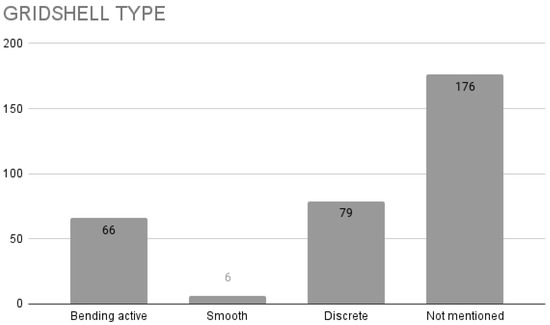 The gridshell type facet was mapped in the four categories, bending active, smooth, discrete and not mentioned, as described in Section 1.1. As seen in Figure 15, the type studied is typically discrete with 79 studies. This is followed by studies on bending active gridshells (66) and smooth (6). There were, however, 176 studies where the type was not mentioned or not possible to determine.