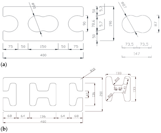 Two types of concrete block systems (unit: mm): (a) peanuts-shaped concrete block; (b) H-shaped concrete block.